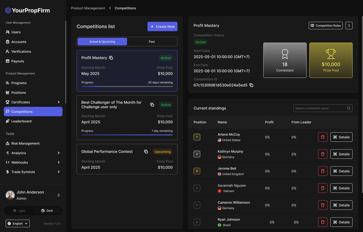 | [**Create & Edit Competition**](https://yourpropfirm.gitbook.io/yourpropfirm-docs/administrator/competition/create-and-edit-competition) | Configuration form for setting up or updating competition details, including schedule, prize, and participant limits. |