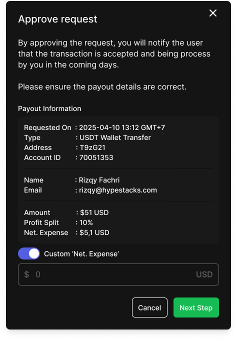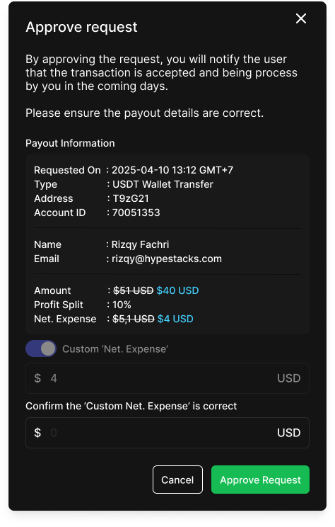* Payout info (user, account ID, requested amount, type, profit split, net expense).