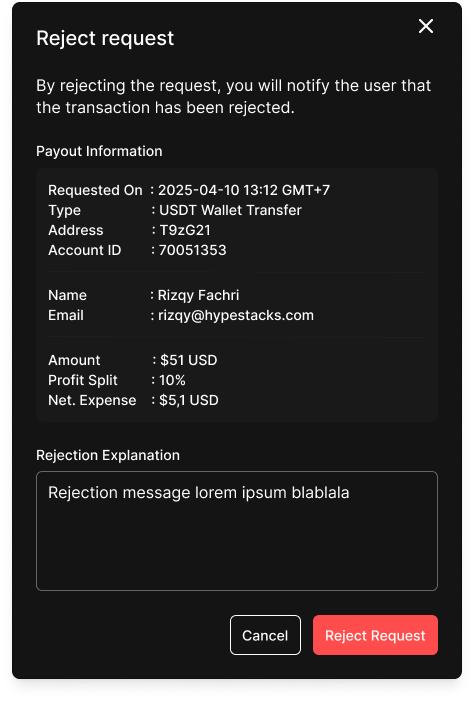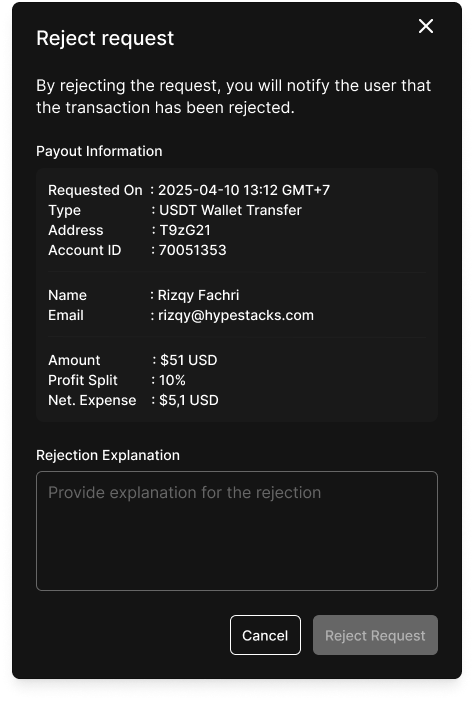 When selecting **Reject**, a modal will prompt the admin to enter a **rejection reason**.