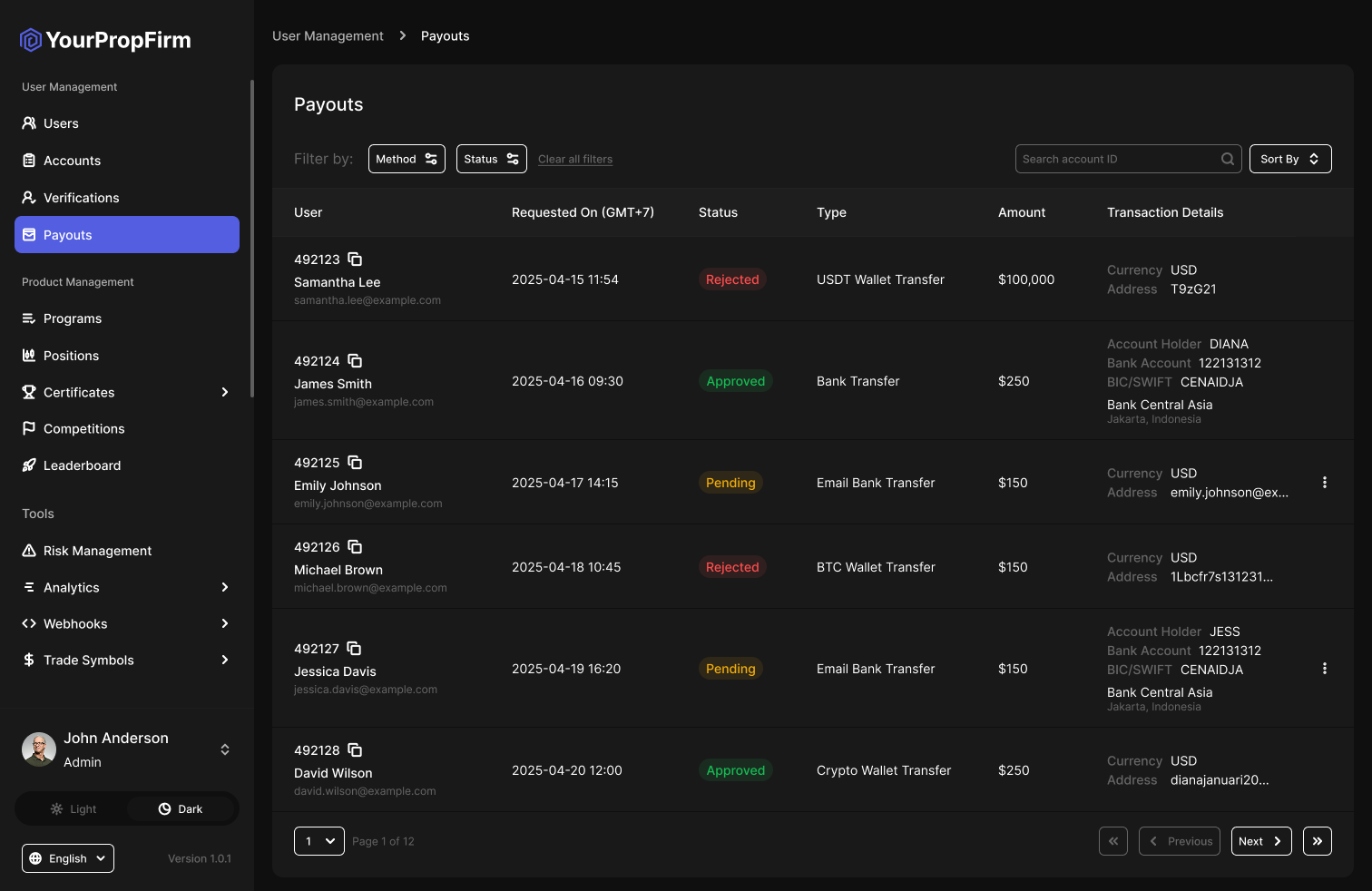 Each payout request is listed in a table, giving administrators the ability to view, track, and update the request status.