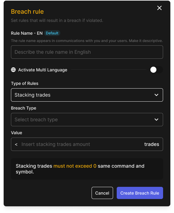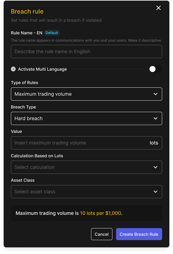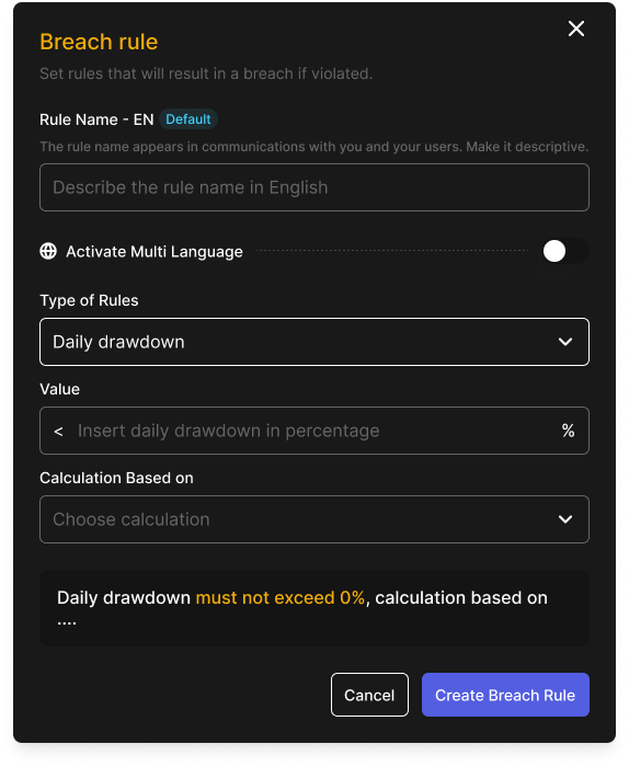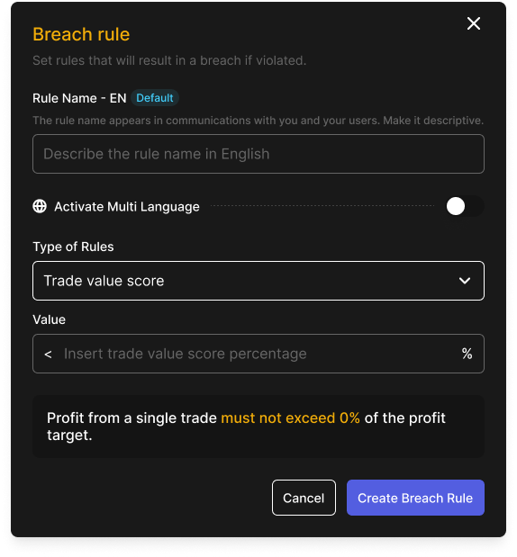 The **Breach Rules** section defines the conditions that will cause an account to breach the program. These rules help enforce consistent trading behavior and risk control.
