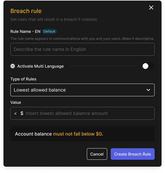 **Lowest Allowed Balance** is similar to equity drawdown, this rule is based on balance. If the active balance drops below the set threshold, a breach is triggered.