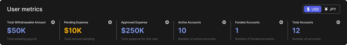 This represents the total amount currently under review or awaiting approval for payout. It reflects the firm's short-term expense exposure based on trader-submitted withdrawal requests.