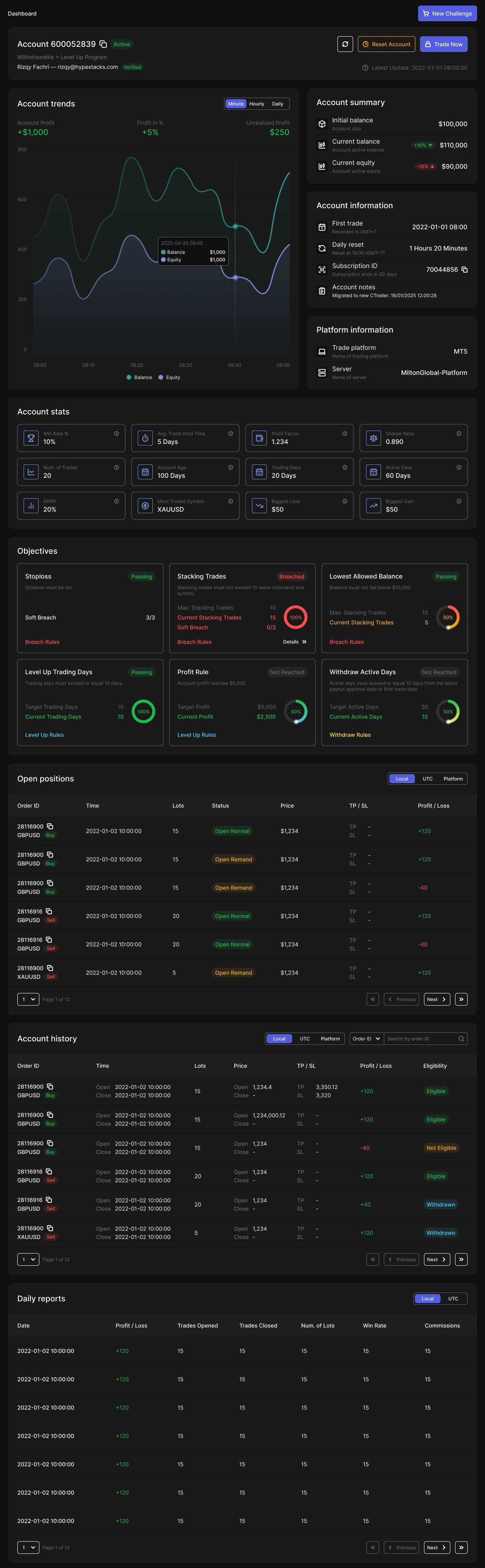 The **Account Dashboard** provides a comprehensive overview of a user's trading account. It is designed to centralize key trading metrics, account status, platform data, and progress toward objectives, offering admins a clear and actionable snapshot in one place.