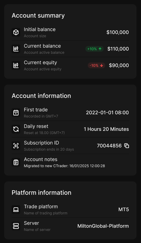 This section provides a consolidated overview of the trading account's core financial metrics, operational metadata, and trading platform details.
