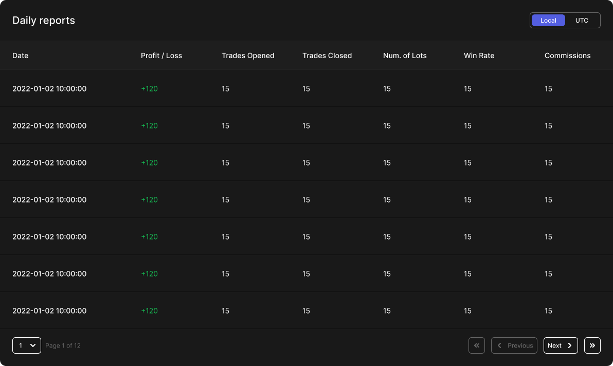 The **Daily Reports** section provides a high-level summary of a trader's performance, calculated daily based on the configured **program reset time**.