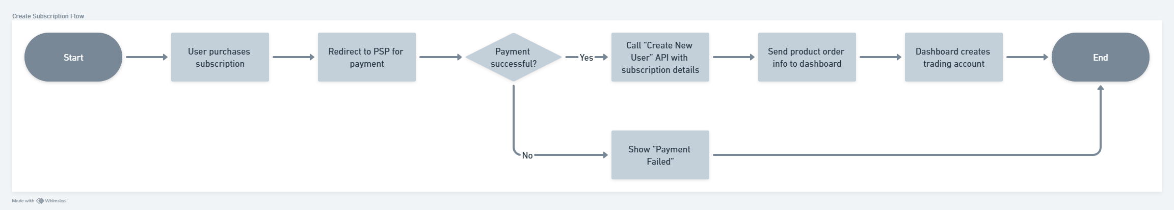 These APIs are used to transmit user and order data at the moment of purchase or subscription change. They ensure that the dashboard can create trader accounts, assign programs, track billing, and enforce subscription-based rules.